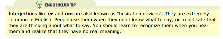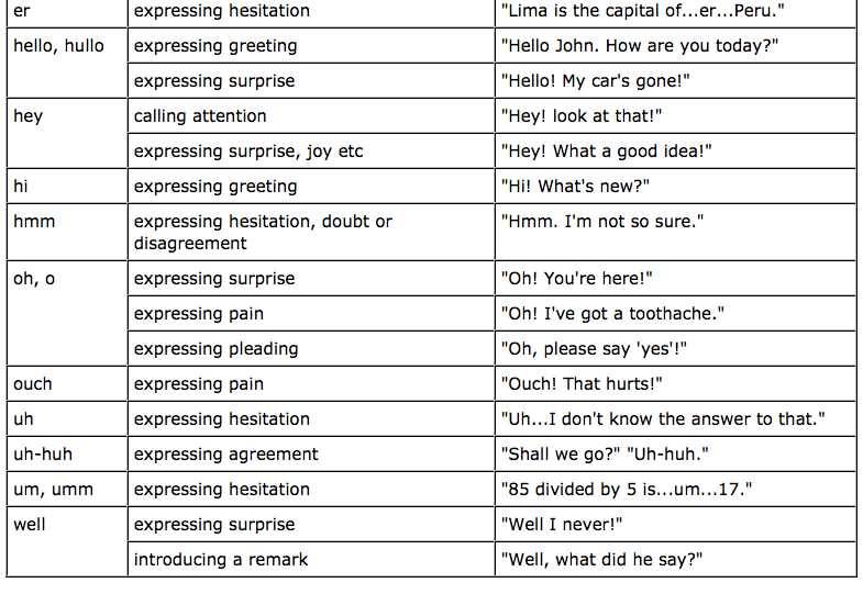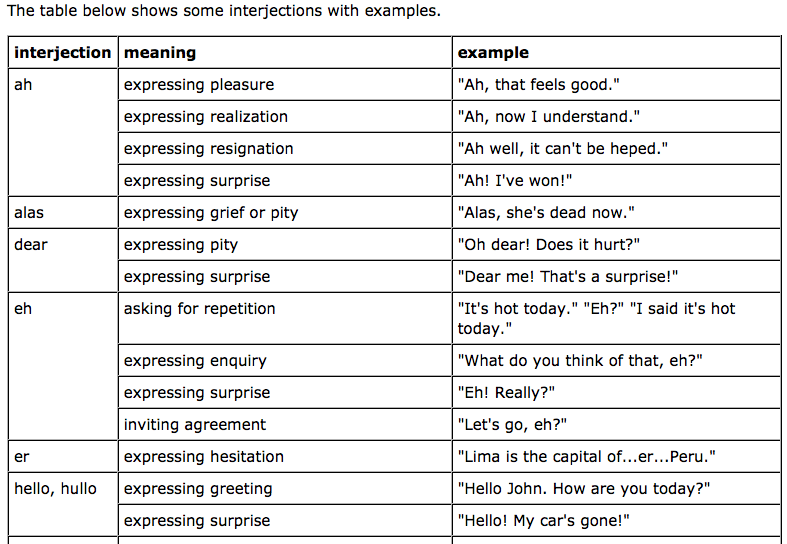 Interjection is a big name for a little word. Interjections are short exclamations like Oh!, Um or Ah! They have no real grammatical value but we use them quite often, usually more in speaking than in writing. When interjections are inserted into a sentence, they have no grammatical connection to the sentence. An interjection is sometimes followed by an exclamation mark (!) when written.